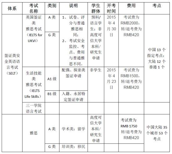 2015年2月20日,英国政府宣布了签证类安全英语语言考试(SELT)的重要变动。2015年3月30日,英国签证类雅思考试、生活技能类雅思考试正式开放报名,首场考试日期分别为:4月30日与4月23日。