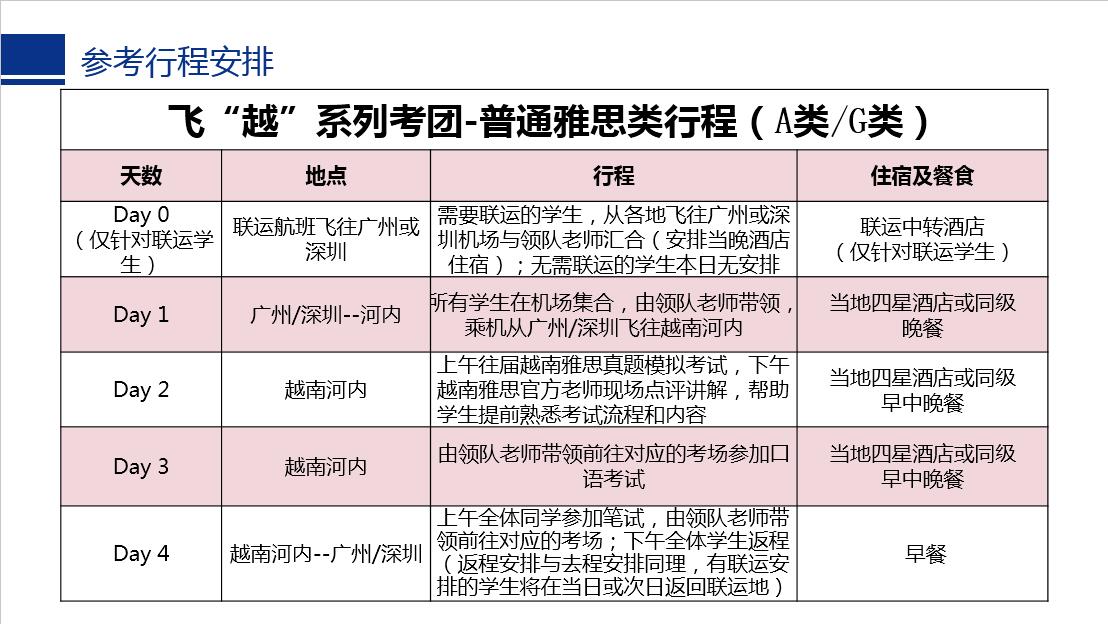 | 2020年新航道越南雅思考试普通雅思类行程(A类/G类) | |||