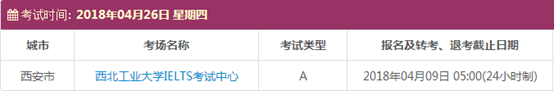 以上,就是上海新航道雅思小编为大家整理的2018年4月陕西雅思考点的考试时间、考位以及考场信息。了解更多2018年雅思考点详情,请点击雅思考试频道 。