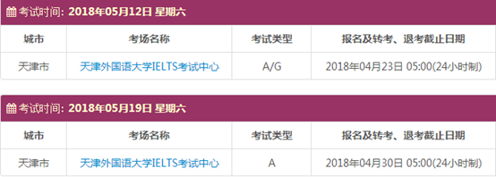 以上,就是上海新航道雅思小编为大家整理的2018年5月天津雅思考点的考试时间、考位以及考场信息。了解更多2018年雅思考点详情,请点击雅思考试频道 。