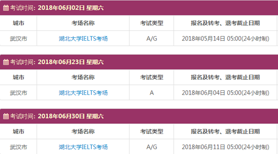 以上,就是上海新航道雅思小编为大家整理的2018年6月湖北雅思考点的考试时间、考位以及考场信息。了解更多2018年雅思考点详情,请点击雅思考试频道 。