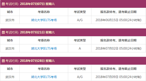 以上,就是上海新航道雅思小编为大家整理的2018年7月湖北雅思考点的考试时间、考位以及考场信息。了解更多2018年雅思考点详情,请点击雅思考试频道 。
