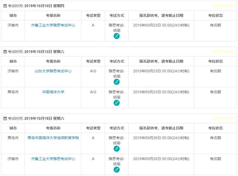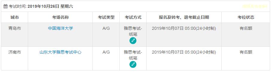 考试时间:2019年10月19日 考点名称:青岛中国海洋大学继续教育学院 齐鲁工业大学雅思考试中心