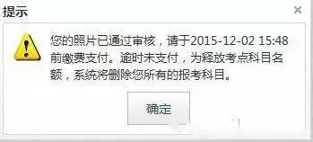 考生的照片通过审核后,须在24 小时内填写调查问卷和完成网上缴费,否则将视为放弃报考,报考信息将被删除。未通过审核的照片,请考生按要求及时更换。