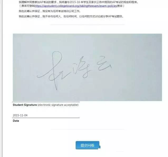 调查问卷填写完成后,须上传考生手写电子签名照片,然后再点击“提交问卷”。