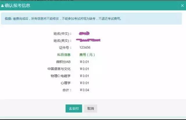 在进行缴费确认时,考生须再次确认报考信息的准确性,一旦完成网上支付,所有信息将不能修改。