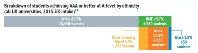此外,亚裔学生学术表现也值得关注。根据2015年的数据,在A-level考试中,达到牛津录取线的亚裔学生为12.3%,在白人以外的学生中比例最高。
