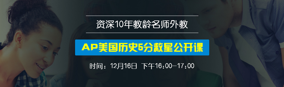 听说AP美国历史高分难!5分难上加难!12月16日,周六下午4:00-5:00,AP美国历史5分救星、国际高中10年教龄资深外教,Gerrard将为你带来一场原汁原味、别开生面的纯英文AP美国史公开课,带你反转美国史,突破瓶颈!