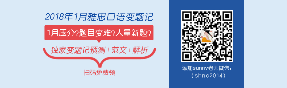 2018年1月雅思考试又将迎来变题季,压分?题目变难?大量新题?.....新一年的1月考试充满恐慌和忧虑?担心自己遇到新题而并没有ready的素材?这些问题,sunny老师统统帮您解决!