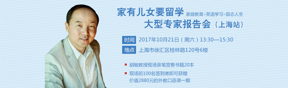 家中有留学儿女的家长更有许多需要学习的地方,比如留学的趋势、如何留学成功、如何为儿女提供支持等。中国雅思之父胡敏教授也有留学的孩子,为了帮助所有家有儿女要留学的家长解答他们不了解的留学之路,胡敏教授来到上海,亲临现场,将他的经验传授给大家。