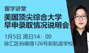 新航道公益课 :藤校+TOP30 美国顶尖综合大学 早申录取情况说明会 本次活动时间:1月5日周日下午14:00
