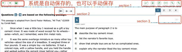 考试工具有3个 section是值得关注的,接下来就按顺序介绍这3个部分。再正式考试的时候,右上角还会有考试时间显示,就和托福类似。在考试的每一个section,页面都会显示距离section结束的倒数时间。在section还有5分钟结束时,会发出一次警报。考生也可以选择隐藏这一倒数时间显示(离section结束只有5分钟不到的时间以后,不能隐藏)。按键位于屏幕右上角。