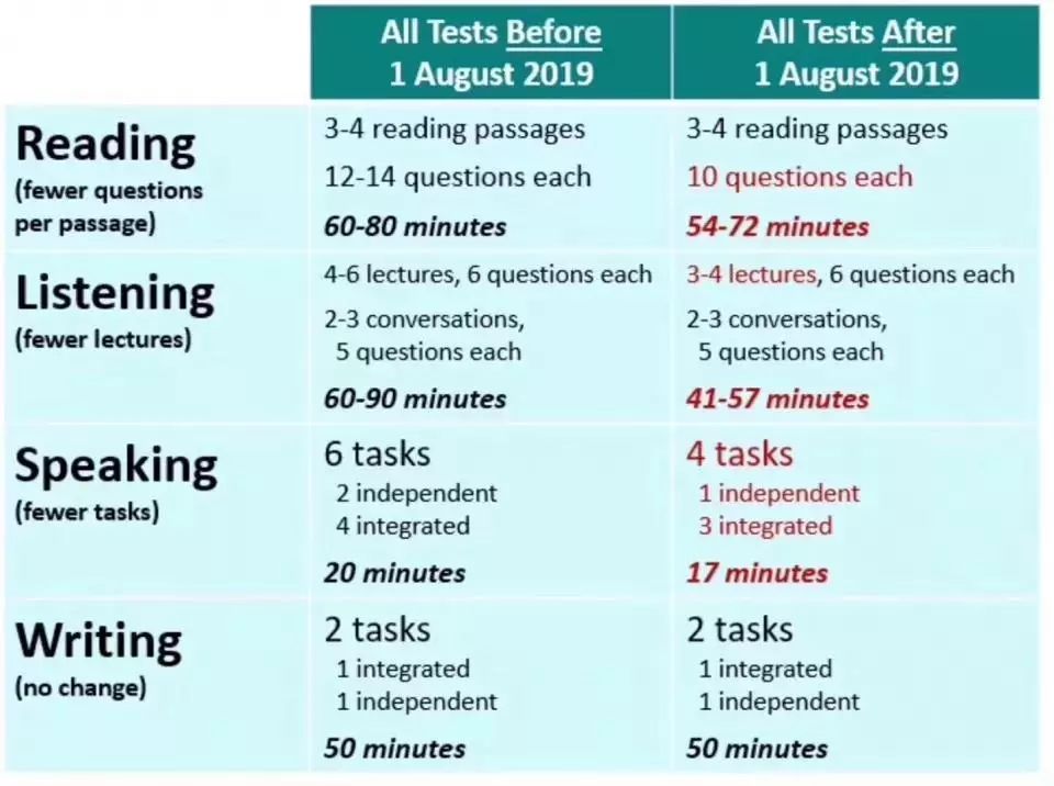 ● 听力部分由4-6个讲座改为3-4个讲座,做题时长由60-90分钟改为41-57分钟。