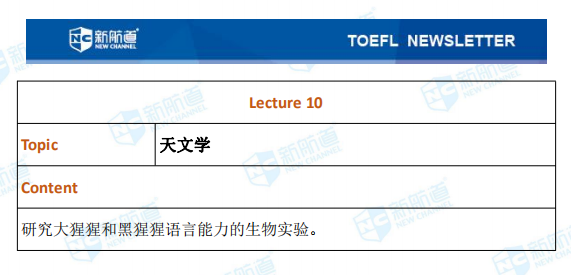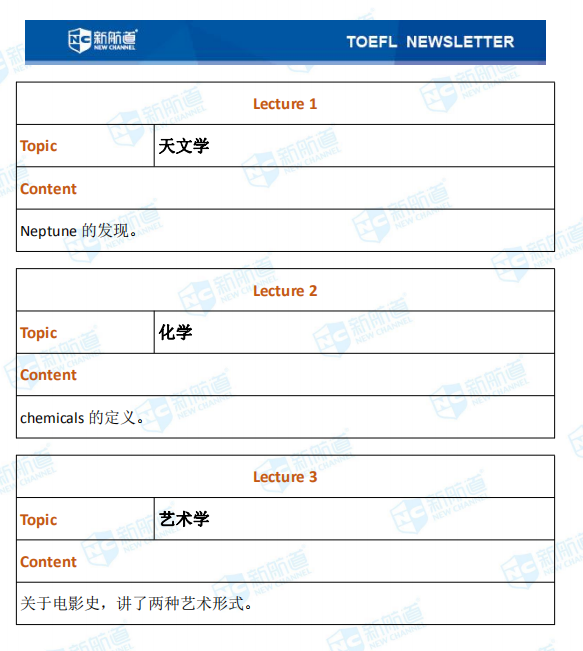 听力考试的lecture部分考了化学、天文学和艺术学等方面的内容。
