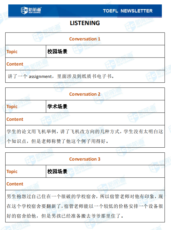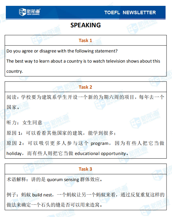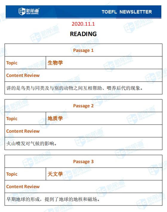 新航道小编第一时间推送本场考试的完整版考题回忆和解析。带你了解最新的考题详情,帮助小伙伴们更好的备战托福,祝宝宝们早日和托福分手!以下就是11月1日的托福考试。