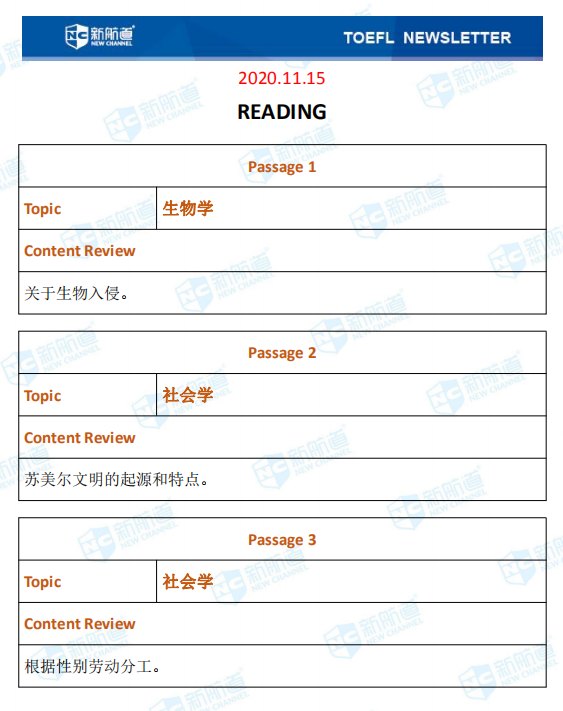 新航道小编第一时间推送本场考试的完整版考题回忆和解析。带你了解最新的考题详情,帮助小伙伴们更好的备战托福,祝宝宝们早日和托福分手!以下就是11月15日的托福考试。