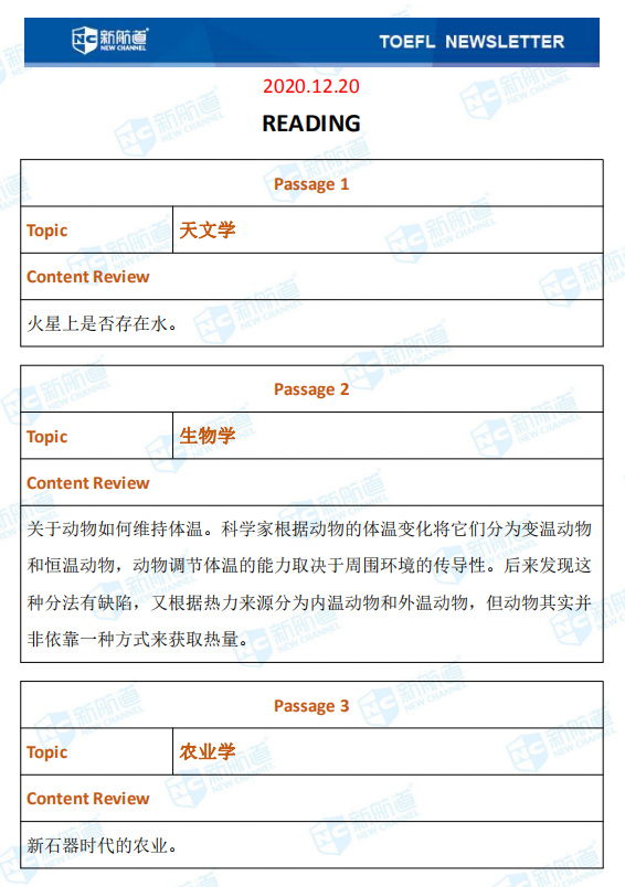 新航道小编第一时间推送本场考试的完整版考题回忆和解析。带你了解最新的考题详情,帮助小伙伴们更好的备战托福,祝宝宝们早日和托福分手!以下就是12月20日的托福考试。