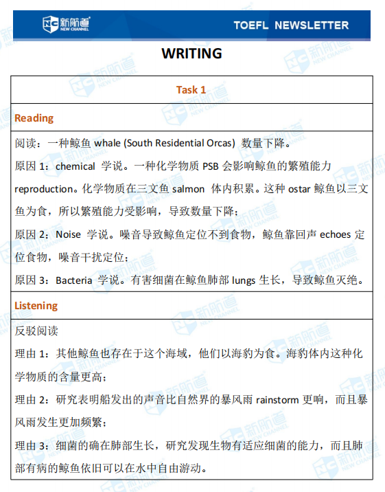 原因1:chemical 学说。一种化学物质PSB会影响鲸鱼的繁殖能力reproduction。化学物质在三文鱼salmon 体内积累。这种ostar鲸鱼以三文鱼为食,所以繁殖能力受影响,导致数量下降;